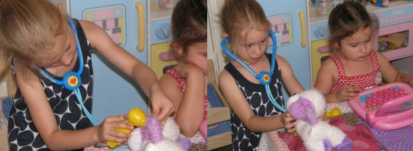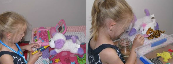 Cách chơi: Trong vai bác sĩ thú y, bé sẽ phải khám bệnh cho con vật, dùng ống nghe tim phổi, đèn soi tai…, sau đó đưa ra chẩn đoán và còn phải chăm sóc tận tình để bệnh nhân mau khoẻ nữa.
