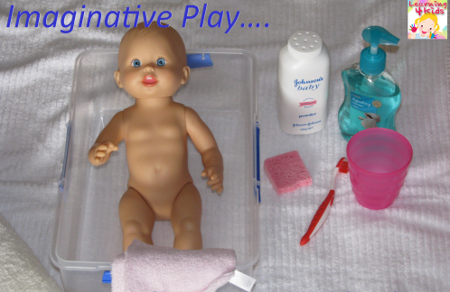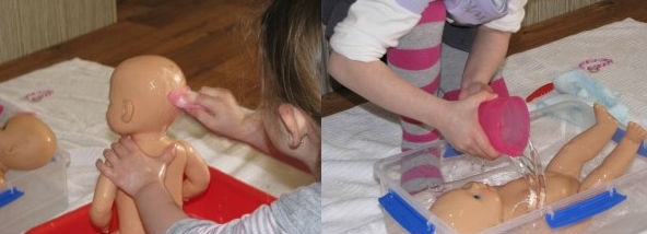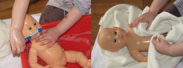 Nguyên liệu: Búp bê em bé, chậu nước, cốc múc nước, khăn, bàn chải đánh răng.