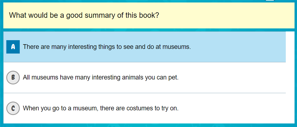 Với một số sách, khi làm quiz, trẻ sẽ bắt gặp câu hỏi yêu cầu trẻ lựa chọn câu nào có thể coi là tóm tắt được nội dung chính của sách.