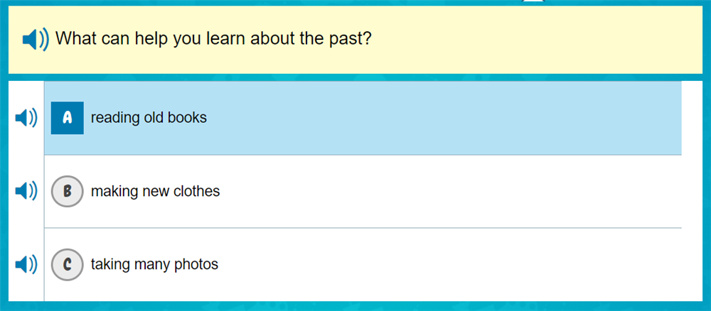 Với một số sách, khi làm quiz, trẻ có thể cần vận dụng kiến thức nền của mình kết hợp với thông tin trong sách để lựa chọn đáp án đúng. Ví dụ câu hỏi trong cuốn sách Learning about the Past - level C - dưới đây "Thứ gì có thể giúp bạn tìm hiểu về quá khứ?". Bằng cách liên hệ với những gì mình đã biết, trẻ có thể lập tức chọn ngay đáp án A - đọc những cuốn sách cũ (reading old books) chứ không phải may quần áo mới (making new clothes) hay chụp thật nhiều ảnh (taking many photos).
