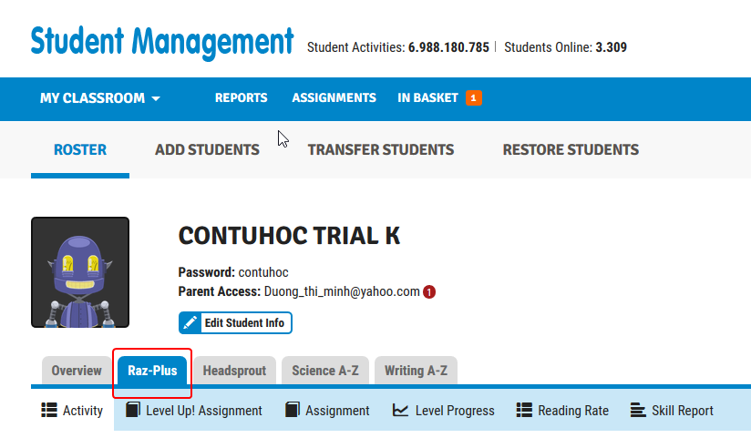 Để xem được các báo cáo về tình hình đọc sách của con trong raz-plus, các bố mẹ đăng nhập bằng tài khoản giáo viên (tài khoản này Con Tự Học gửi cùng với tài khoản học sinh trong email cấp tài khoản), sau đó click vào My Classroom và click vào tên của con mình.