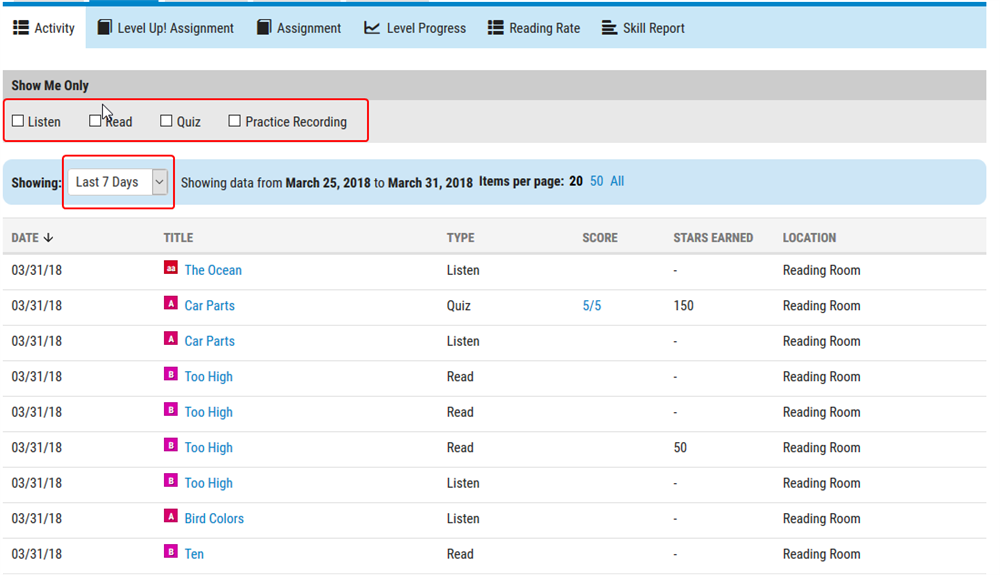Báo cáo này cho bố/mẹ biết chi tiết con đã nghe, đọc, ghi âm, trả lời câu hỏi và kết quả làm quiz của con đối với từng book cụ thể. Đối với báo cáo này bạn có thể chọn chỉ xem những sách mà con đã ghi âm hoặc đã làm quiz bằng cách click vào tùy chọn ở phía trên báo cáo, phần Show me Only.
