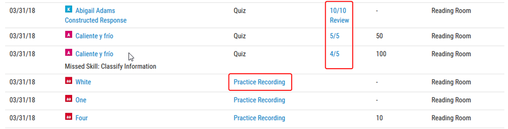 Ngoài ra, để xem chi tiết phần trả lời quiz của con hoặc nghe lại phần bài đọc mà con đã ghi âm, bạn click vào kết quả quiz hoặc chữ Practice Recording tương ứng với book mà con đã đọc.