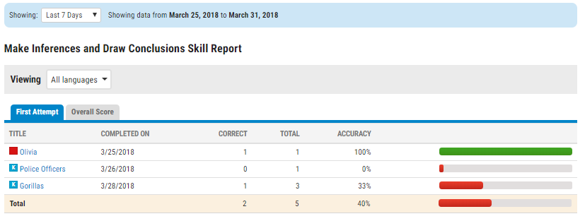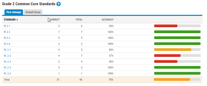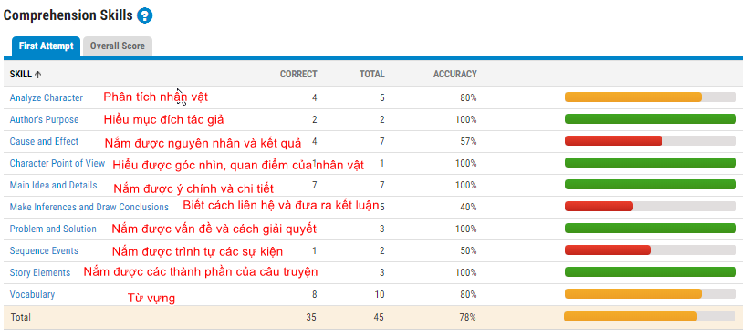 Lưu ý, First Attem là tính kết quả khi bé trả lời quiz lần đầu tiên, còn Overall Score là tính tất cả các lần trả lời quiz.
