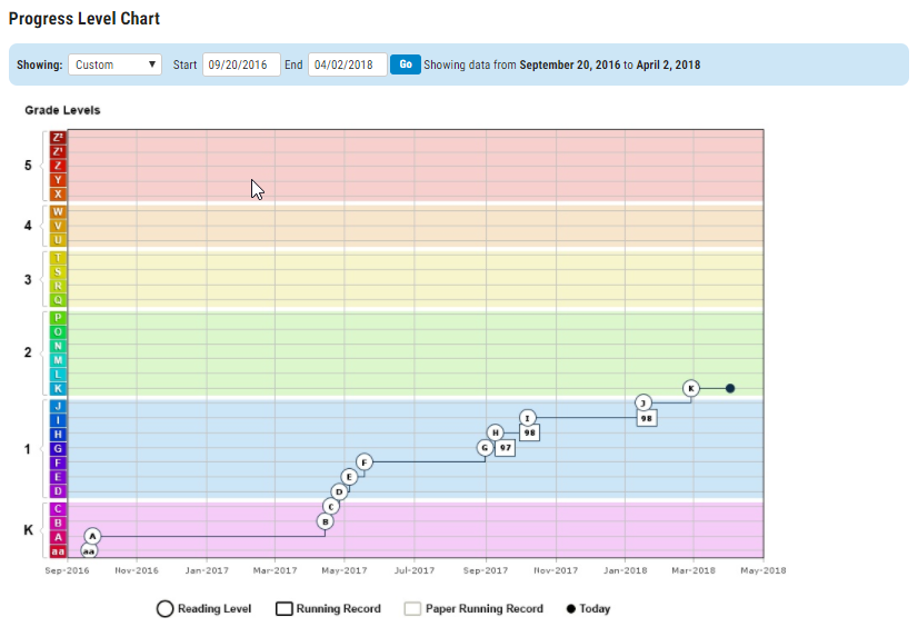 Báo cáo này cho bố/mẹ thấy được sự tiến bộ, thay đổi level đọc của con theo thời gian. Khi bé đọc hết tất cả các books trong phần level-up, chương trình sẽ tự chuyển sang level đọc cao hơn. Ngoài ra nếu có các bài Running record (bài test đánh giá do giáo viên giao), kết quả của bài test ví dụ trong hình là 97, 98 cũng được thể hiện trong báo cáo này.