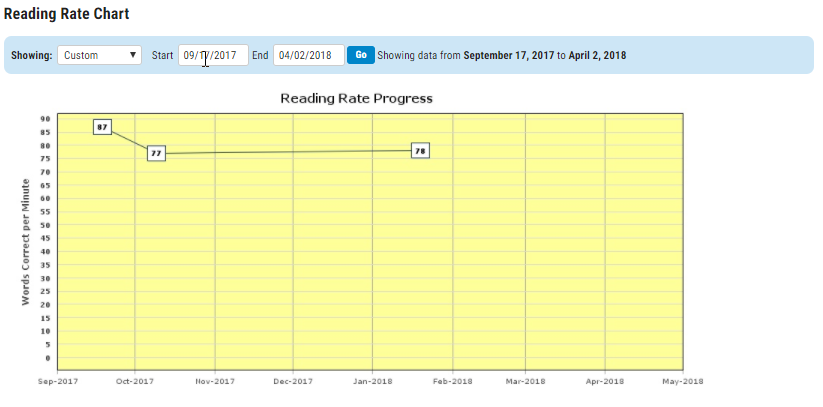 Báo cào này thể hiện tốc độ đọc của con thay đổi qua thời gian, thể hiện bằng số từ đọc đúng trên 1 phút. Để có dữ liệu của báo cáo này bé phải thực hiện Running record và có phần chấm bài của giáo viên (bố mẹ có thể dùng tài khoản giáo viên để giao bài assessment và đánh giá cho con)