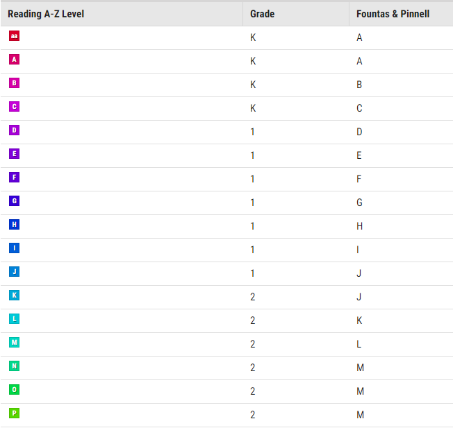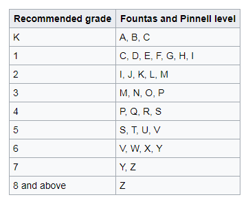 Bảng ánh xạ khối lớp học với trình độ Graded Reading Level của Fountas & Pinnell. Nguồn: Wikipedia