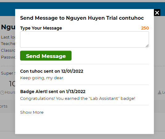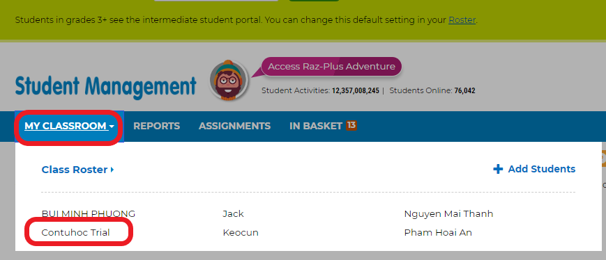 Bước 1: Đăng nhập tài khoản teacher, bấm chọn My classroom, chọn tên học sinh.