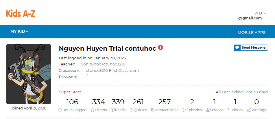 Theo dõi nhanh tình hình học tập của con trên Kids A-Z bằng tài khoản Parent