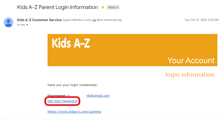 Mở email, nhấn chọn Set your password để đặt mật khẩu cho tài khoản Parent của bạn. Lưu ý: Mật khẩu không được bao gồm các kí tự đặc biệt như @; !; - ...