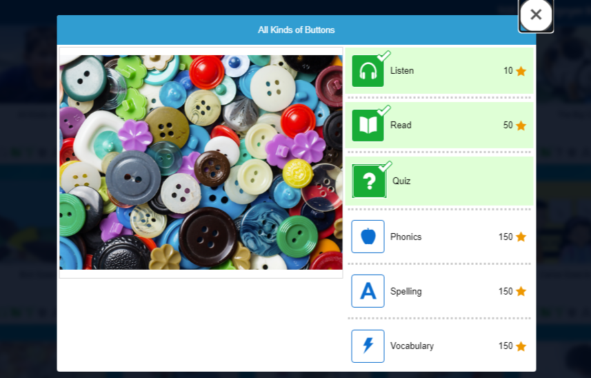 Bộ bài tập từ vựng gồm Phonics, Spelling và Vocabulary đã hiển thị ngay với sách Raz-Plus (trong hình là cuốn All kinds of Buttons - level A)