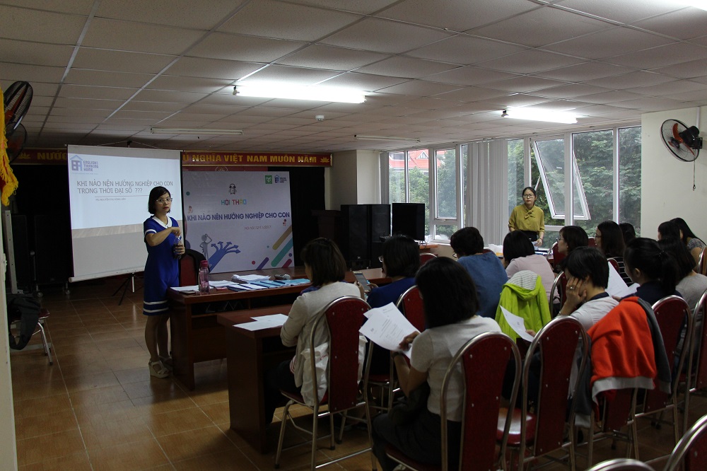 Hội thảo "Khi nào nên hướng nghiệp cho con" đã được diễn giả Nguyễn Thị Hồng Liên bắt đầu rất đúng giờ, theo nguyên tắc tôn trọng những phụ huynh đã đến sớm. Sau hai hoạt động khởi động để các phụ huynh (PH) kết nối, kích hoạt khả năng tập trung và khả năng tương tác, hội thảo đã bắt đầu với phần chia sẻ thực tế về lựa chọn và trải nghiệm nghề nghiệp của các PH.