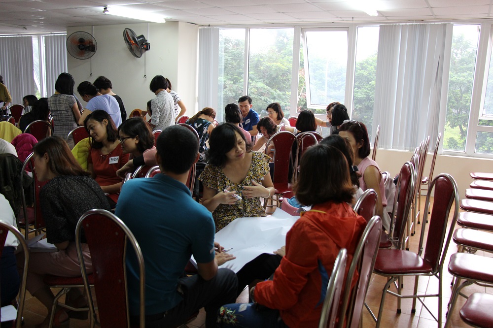 Tiếp đến là hoạt động kết nhóm làm bài chia sẻ về trải nghiệm từng có một công việc mới mà mình từng muốn làm nhưng không dám làm vì trở ngại nào đó. Các phụ huynh đã làm hết sức nhiệt tình: