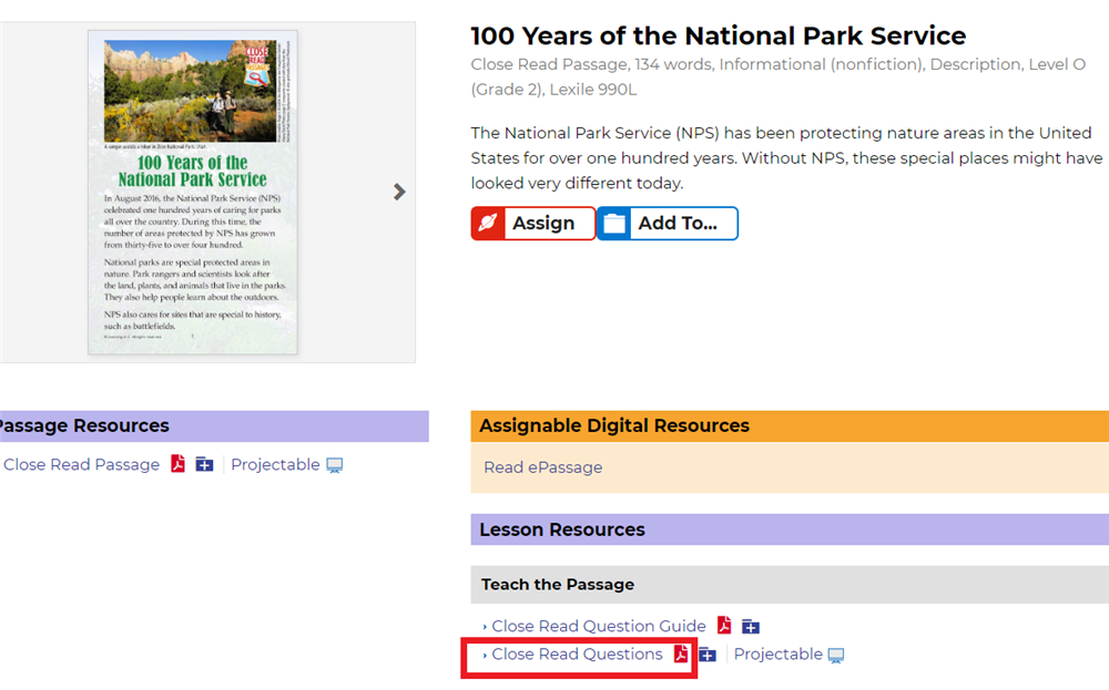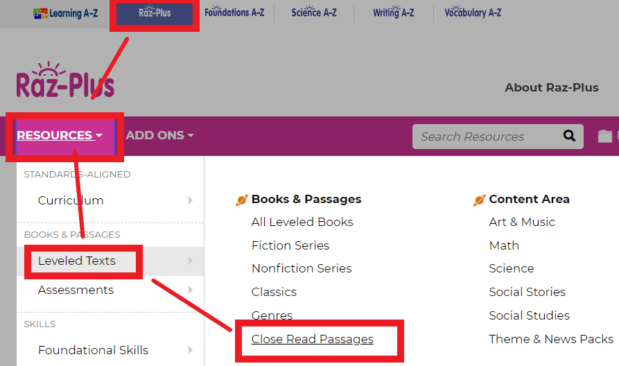 Bước 3: Chọn Resources > Leveled Texts > Close Read Passages