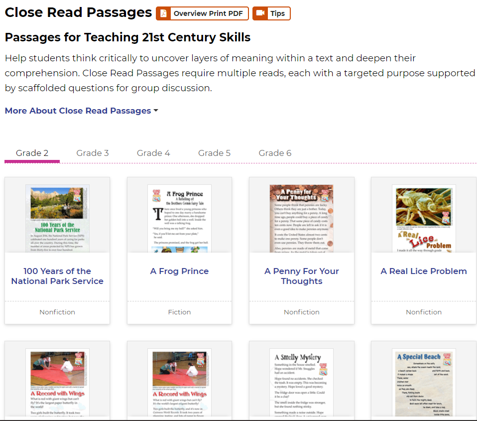Bộ học liệu Close Read Passages gồm các văn bản ngắn dành cho trẻ từ grade 2 tới grade 6 thực hành kỹ năng đọc chuyên sâu.