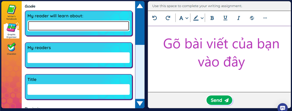- Draft - gõ bài viết vào khung soạn thảo bên tay phải. Trong quá trình viết, các công cụ bên trái sẽ giúp các em đối chiếu dàn ý mình tạo ra từ bước trước một cách thuận tiện, dễ dàng hơn.